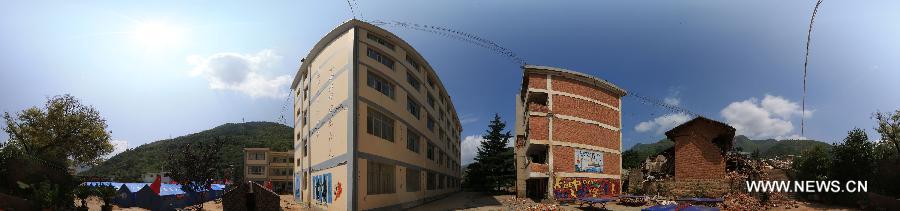 Panoramic photo taken on Aug. 5, 2014 shows quake-hit Longtoushan Town of Ludian County, southwest China's Yunnan Province, Aug. 5, 2014. At least 398 people have been killed after a 6.5-magnitude earthquake rattled the province Sunday afternoon. The epicenter of the strong quake is in Longtoushan Town. (Xinhua/Xing Guangli)