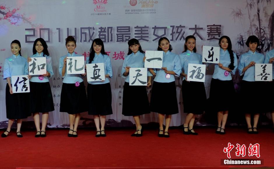 | Girls display the beauty of Qipao (Mandarin Gown) and school uniforms with special features during the 2014 Chengdu Most Beautiful Contest with the blooming years as the theme in Chengdu, southwest China’s Sichuan province, August 2, 2014.(Chinanews.com/ Ye Jian) |