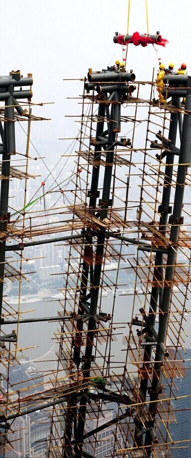 Workers celebrate the completion of Shanghai Tower