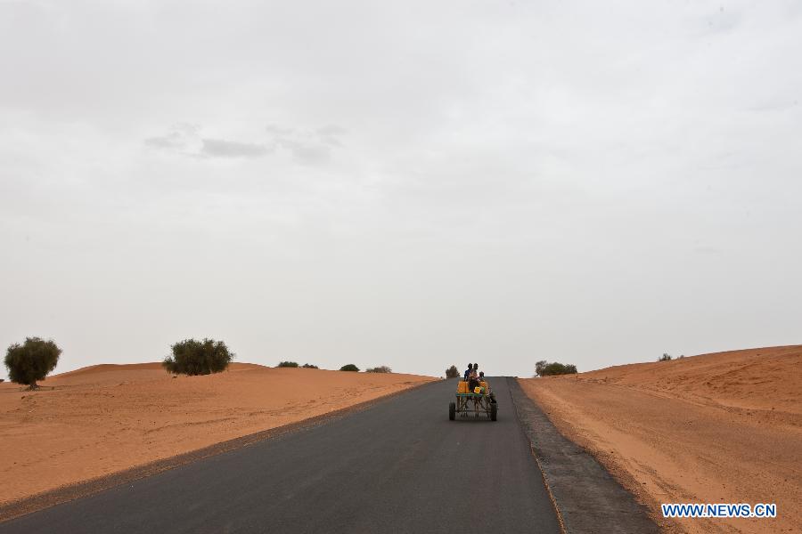 Local villagers ride on the road constructed by China in the Brakna Region, southern Mauritania, Aug. 4, 2014. The 172km road which connects regions of Aleg, Kiffa, Assaba and Brakna, all located in Western Sahara, belongs to one of the China's assistance constructions in the northwest African country. (Xinhua/Li Jing)