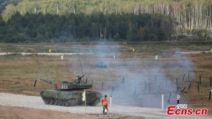 China's Type 96A main battle tank is seen at the tank biathlon championship in the Alabino firing range of Moscow region, Russia on August 4, 2014. (CNS/Jia Jingfeng)