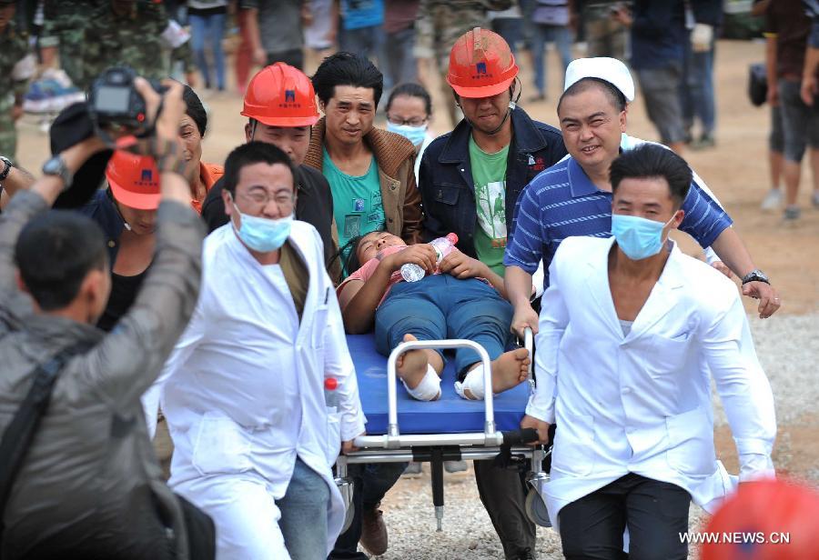 Medical workers transfer an injured citizen to a helicopter in Longtoushan Town of Ludian County, the epicenter of a 6.5-magnitude earthquake, in southwest China's Yunnan Province, Aug. 5, 2014. Military helicopters have been deployed to transfer those who were injured in the earthquake that hit Yunnan and deliver disaster relief supplies. Air delivery is expected to avoid ground barriers after the quake and offer higher rescue efficiency. (Xinhua/Xue Yubin)