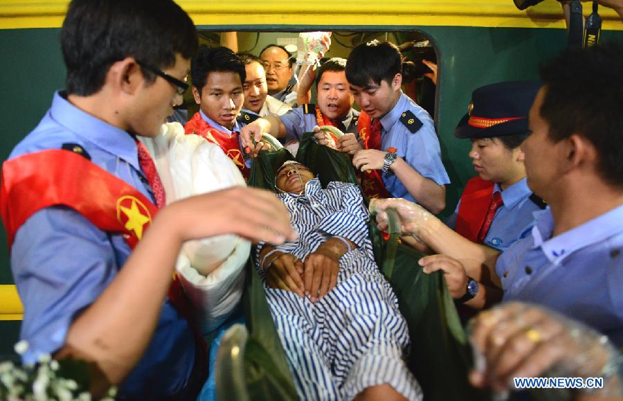 | A person injured in quake-hit area is carried to get off a special train after arriving at the Kunming Railway Station in Kunming, capital of southwest China's Yunnan Province, Aug. 5, 2014. The 6.5-magnitude earthquake that struck Yunnan's Ludian County on Sunday afternoon has left at least 410 people dead. (Xinhua/Hou Wenkun) |