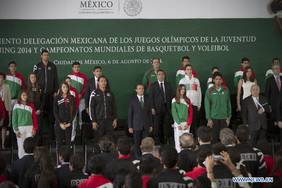 Mexican President Enrique Pena Nieto (C) attends the flag ceremony of the Mexican delegation for the 2014 Nanjing Youth Olympic Games and for the men's and women's national teams of volleyball and the men's national team of basketball for the World Championships, at Los Pinos Official Residence in Mexico City, capital of Mecico, on Aug. 6, 2014. (Xinhua/Alejandro Ayala)