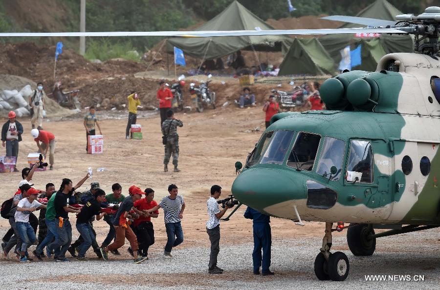 Rescuers carry an injured civillian to a helicopter in a temporary settlement set up after a 6.5-magnitude earthquake in Ludian County of Zhaotong, southwest China's Yunnan Province, Aug. 6, 2014. Disaster relief work is in progress after the earthquake struck Yunnan on Sunday afternoon. Civillians in temporary settlements within areas that are most severely affected have already had access to fresh meal and potable water. (Xinhua/Lin Yiguang)