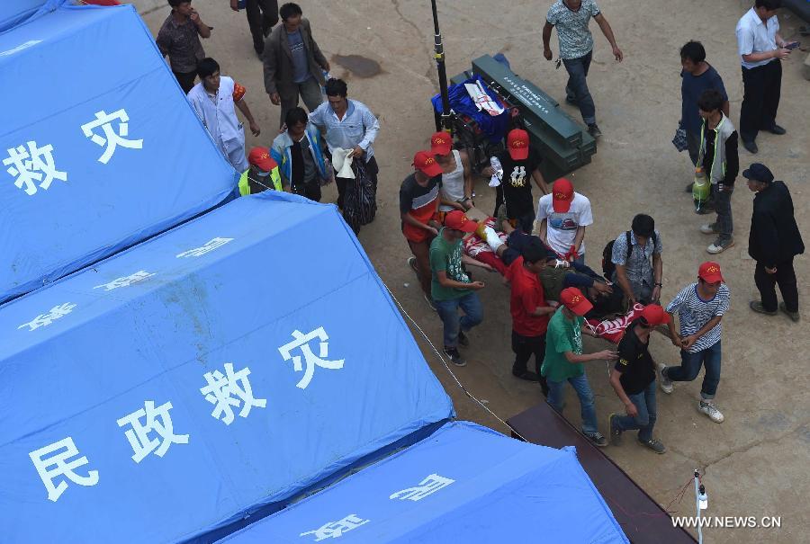 Rescuers carry an injured civillian to the medical service in a temporary settlement set up after a 6.5-magnitude earthquake in Ludian County of Zhaotong, southwest China's Yunnan Province, Aug. 6, 2014. Disaster relief work is in progress after the earthquake struck Yunnan on Sunday afternoon. Civillians in temporary settlements within areas that are most severely affected have already had access to fresh meal and potable water. (Xinhua/Lin Yiguang)