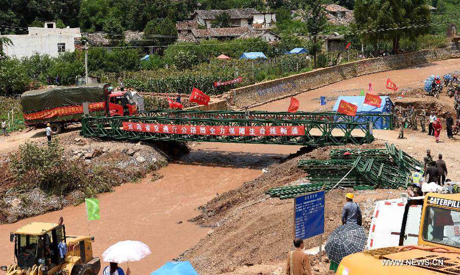 | A truck crosses a temporary bridge built after a 6.5-magnitude earthquake in Ludian County of Zhaotong, southwest China's Yunnan Province, Aug. 6, 2014. Disaster relief work is in progress after the earthquake struck Yunnan on Sunday afternoon. Civillians in temporary settlements within areas that are most severely affected have already had access to fresh meal and potable water. (Xinhua/Lin Yiguang) |