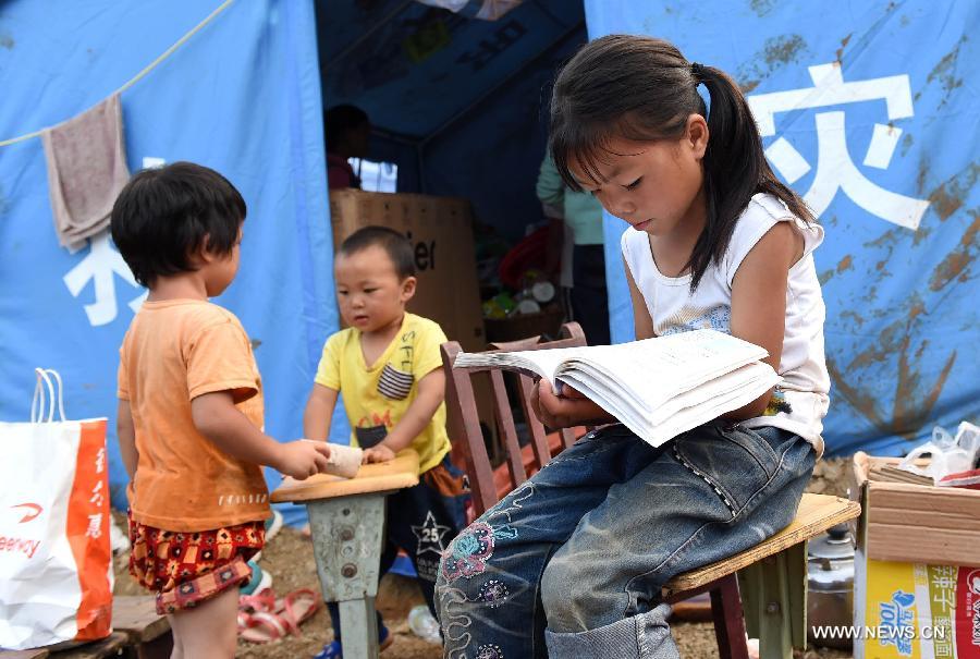 Luo Hongxia (R), 9, reads a book at a temporary resettlement in quake-hit Longtoushan Town of Ludian County, southwest China's Yunnan Province, Aug. 6, 2014. (Xinhua/Lin Yiguang)