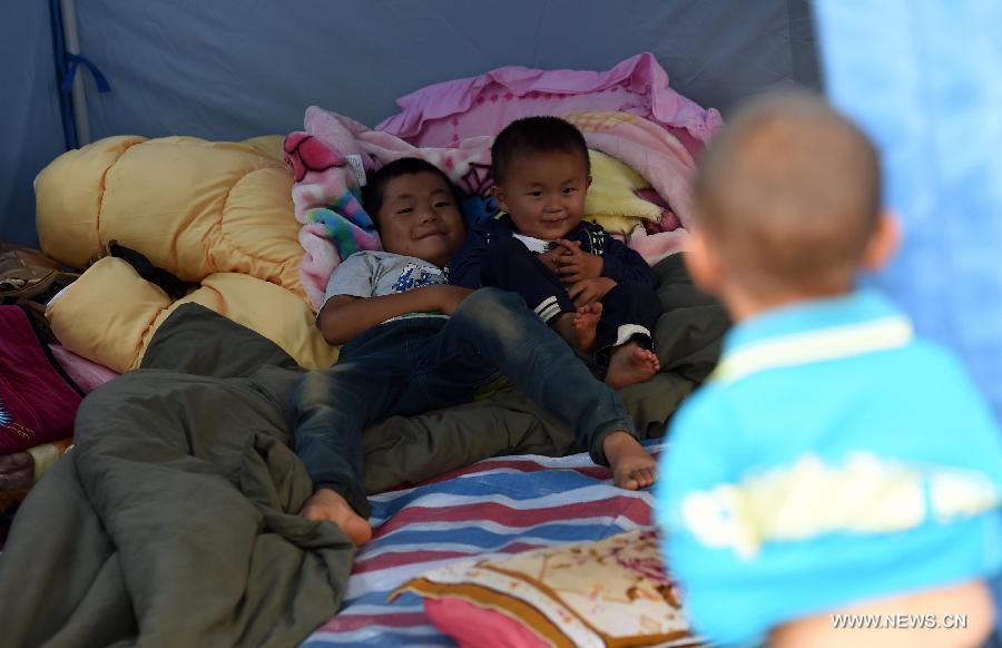 Young boys play at a temporary resettlement in quake-hit Longtoushan Town of Ludian County, southwest China's Yunnan Province, Aug. 6, 2014. (Xinhua/Lin Yiguang)