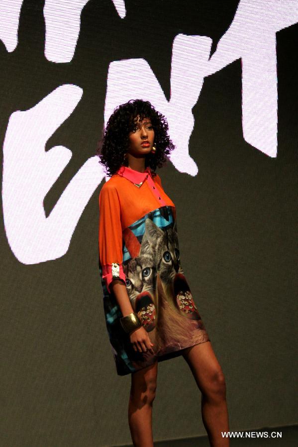 A model presents a creation by Danish Designer Nicholas Nybro during the ongoing Copenhagen Fashion Week in Copenhagen, Denmark, Aug.7, 2014. (Xinhua/Wu Bo)