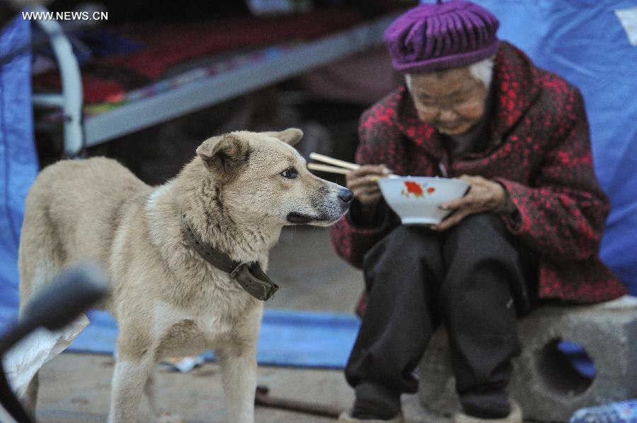 Xia Kaimei, 87, is accompanied by her dog Dahuang while having dinner outside a makeshift tent set up after a 6.5-magnitude earthquake in Longquan Village under Longtoushan Town of Ludian County, Zhaotong, southwest China's Yunnan Province, Aug. 6, 2014. (Xinhua/Liu Xu)