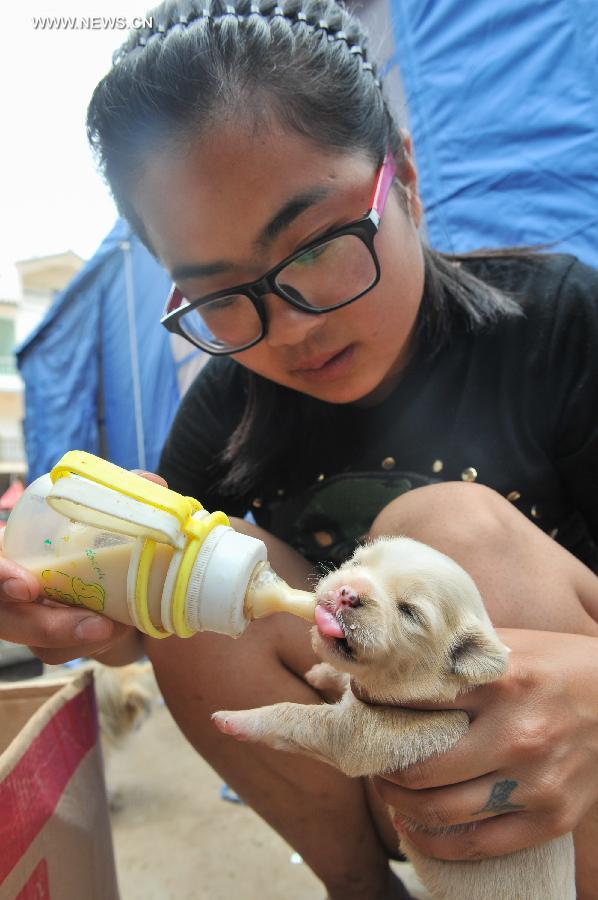 Li Yu, a girl from Longquan Village, feeds milk to a pup she adopted after a 6.5-magnitude earthquake in Ludian County, Zhaotong, southwest China's Yunnan Province, Aug. 7, 2014. (Xinhua/Liu Xu)