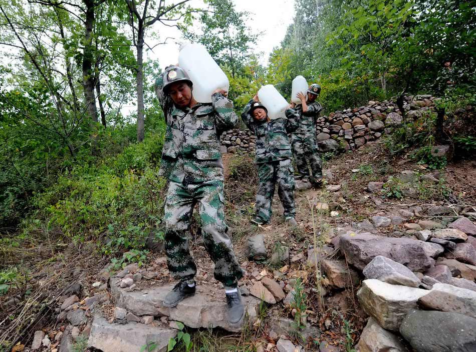 | Team members walk on the rugged mountain road, shouldering 30 kilograms of water in Lushan County, Henan province on August 5, 2014. (Xinhua/Li An) |