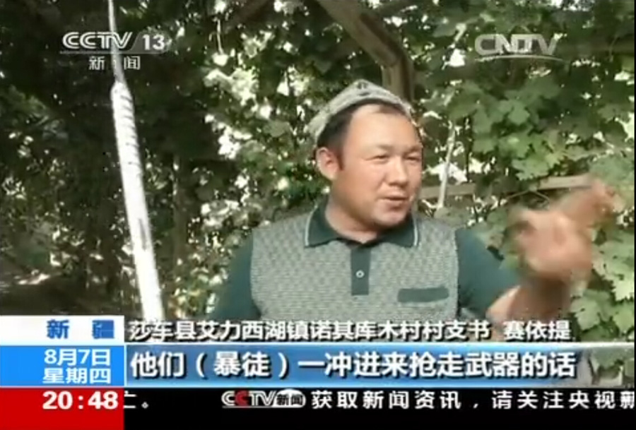 Saiyiti, the party branch secretary of Nuoqikumu Village, recalled: “The village committee has 13 spears. We can’t let them come in and take away those weapons.”(Screenshot of CCTV)