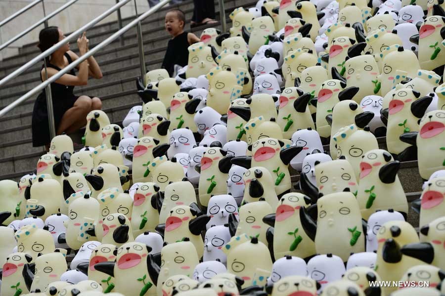 Tourists pose for photo with "Pan Da" in Shanghai World Financial Center in Shanghai, east China, Aug. 8, 2014. 1000 "Pan Da", which were made by different crafts, appear in Shanghai World Financial Center on Friday. (Xinhua/Lai Xinlin)