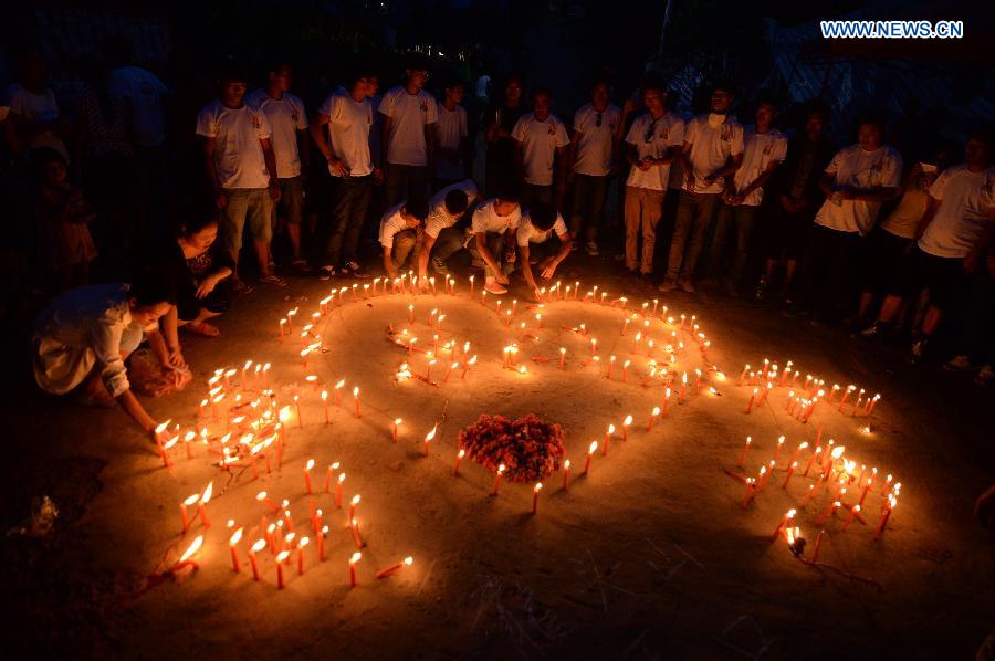 People light candles to mourn for the victims after a 6.5-magnitude earthquake in Longtoushan Town under Ludian County of Zhaotong, southwest China's Yunnan Province, Aug. 8, 2014. Death toll from the quake that struck Yunnan on Sunday afternoon has risen to 617 as of 3:00 p.m. Friday. (Xinhua/Hu Chao)