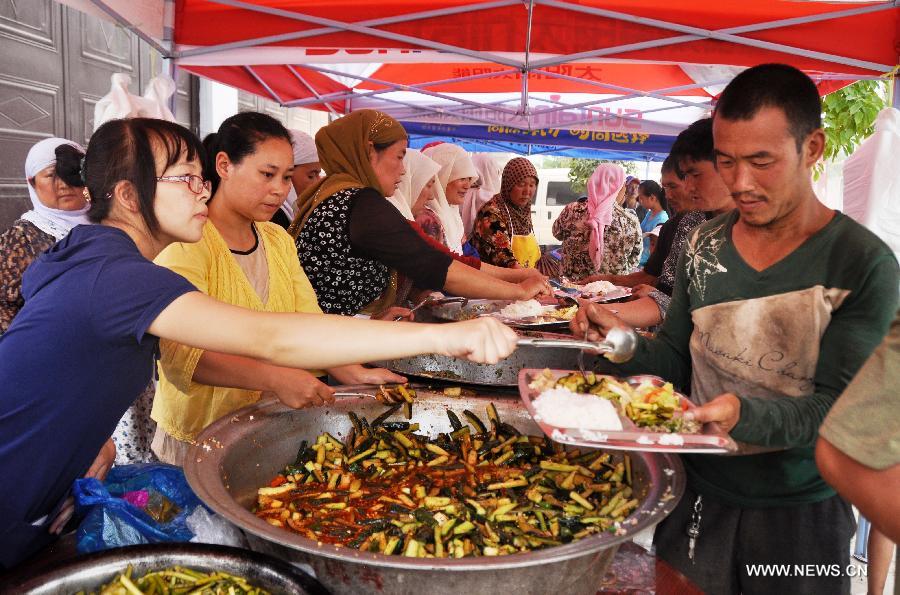 | Local residents offer free meals for rescuers, volunteers and victims in quake-hit Longtoushan Town of Ludian County, southwest China's Yunnan Province, Aug. 8, 2014. 44510 tents, 10000 emergency lights, 65997 overcoats have arrived in the quake stricken area. 11 villages of Longtoushan Town have already received relief materials. (Xinhua/Yang Wenbin) |