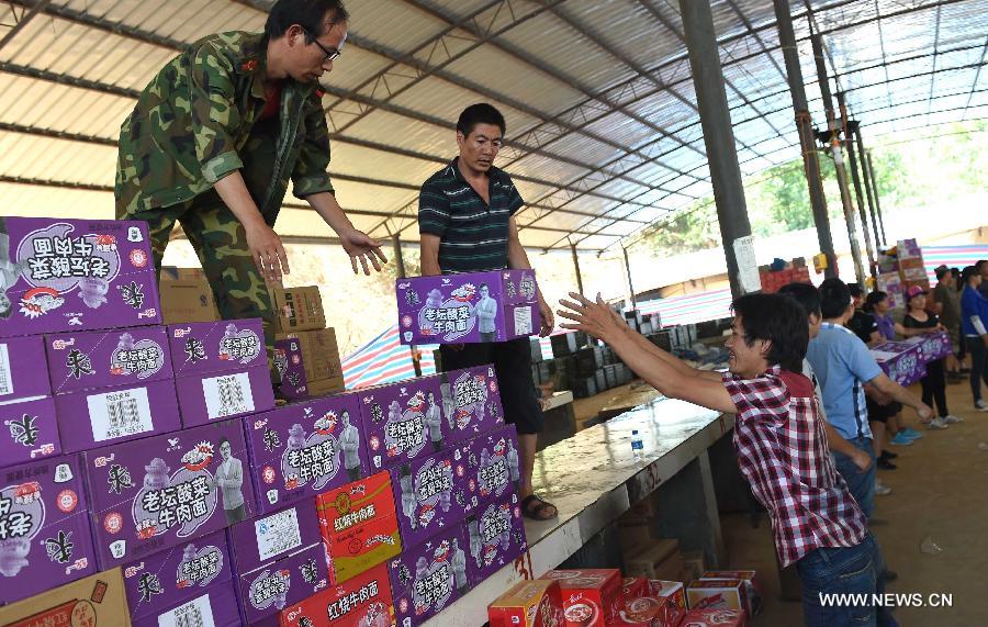 Workers put relief materials in a relief materials center in quake-hit Longtoushan Town of Ludian County, southwest China's Yunnan Province, Aug. 8, 2014. 44510 tents, 10000 emergency lights, 65997 overcoats have arrived in the quake stricken area. 11 villages of Longtoushan Town have already received relief materials. (Xinhua/Lin Yiguang)
