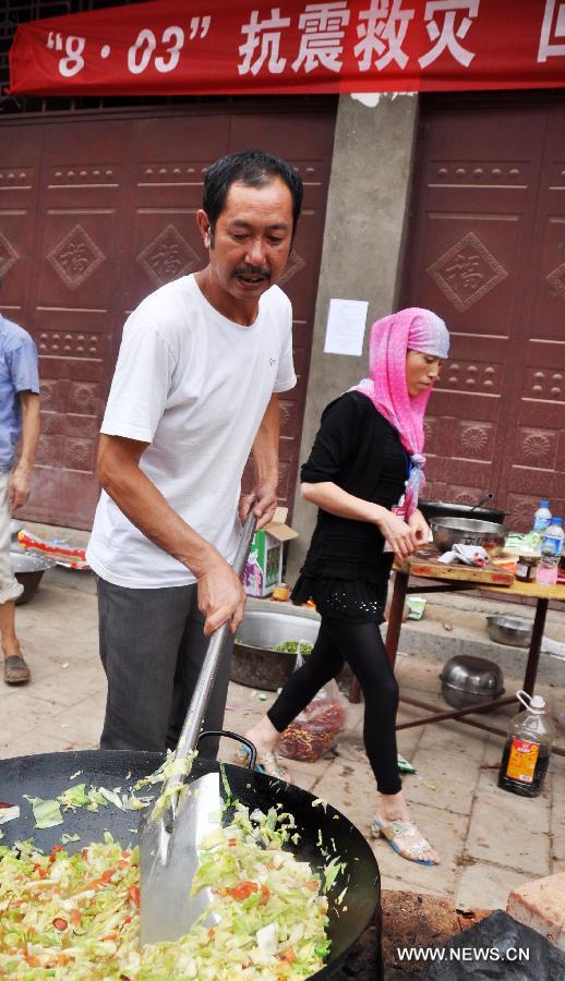 Local residents offer free meals for rescuers, volunteers and victims in quake-hit Longtoushan Town of Ludian County, southwest China's Yunnan Province, Aug. 8, 2014. 44510 tents, 10000 emergency lights, 65997 overcoats have arrived in the quake stricken area. 11 villages of Longtoushan Town have already received relief materials. (Xinhua/Yang Wenbin)