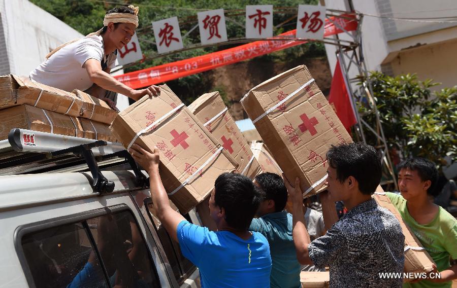 Victims in Ludian earthquake lift household medikits onto a vehicle in quake-hit Longtoushan Town of Ludian County, southwest China's Yunnan Province, Aug. 8, 2014. 44510 tents, 10000 emergency lights, 65997 overcoats have arrived in the quake stricken area. 11 villages of Longtoushan Town have already received relief materials. (Xinhua/Lin Yiguang)