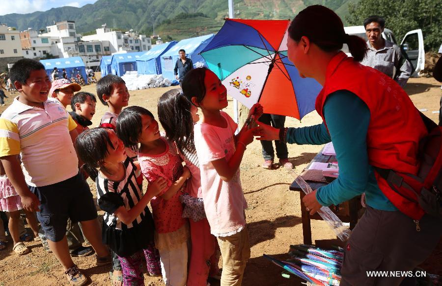 A volunteer hands out umbrellas to children after a 6.5-magnitude earthquake in Ludian County of Zhaotong, southwest China's Yunnan Province, Aug. 10, 2014. Disaster relief work is in progress after the earthquake struck Yunnan. Civilians in temporary settlements within areas that are most severely affected have already had access to fresh meal and potable water. (Xinhua/Pei Xin)