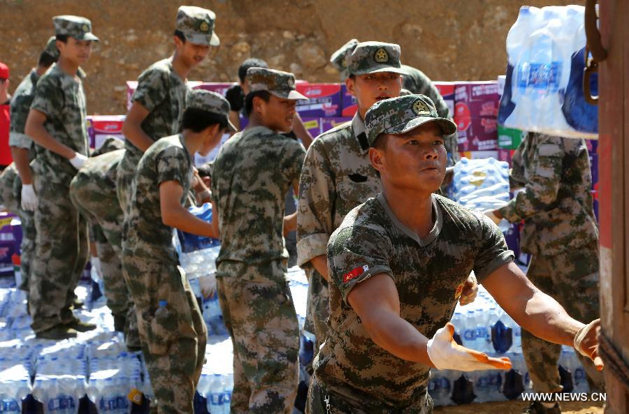 | Soldiers unload the newly brought disaster relief materials after a 6.5-magnitude earthquake in Ludian County of Zhaotong, southwest China's Yunnan Province, Aug. 10, 2014. Disaster relief work is in progress after the earthquake struck Yunnan. Civilians in temporary settlements within areas that are most severely affected have already had access to fresh meal and potable water. (Xinhua/Pei Xin) |