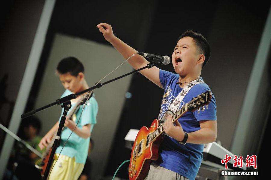 | The 4th National Kids’ Rock Band Contest was held in Tianjin on Aug 10, 2014. Sixteen kids rock bands from various provinces of the country competed for the championship. Children rock n' roll music has become a hit recently in China with the development of modern music. More parents choose to have their children learn instruments like guitar, drums, or bass. (Chinanews/Tong Yu) |