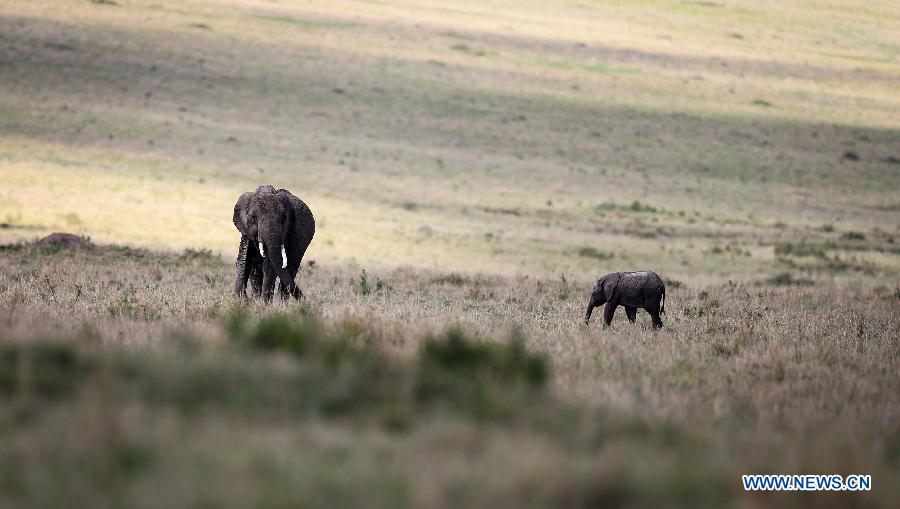 File photo shows an African elephant and its cub are seen in the Maasai Mara National Reserve, Kenya, Nov. 24, 2013. The World Elephant Day was launched on Aug. 12, 2012 to bring attention to the urgent plight of Asian and African elephants. The escalation of poaching, habitat loss and human-elephant conflict are some of the threats to both African and Asian elephants. (Xinhua/Meng Chenguang)