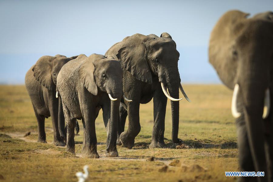 File photo shows African elephants are seen at the Amboseli National Park of Kenya, July 16, 2014. The World Elephant Day was launched on Aug. 12, 2012 to bring attention to the urgent plight of Asian and African elephants. The escalation of poaching, habitat loss and human-elephant conflict are some of the threats to both African and Asian elephants. (Xinhua/Meng Chenguang)