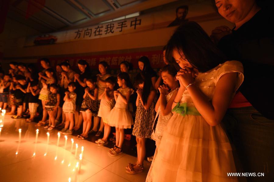 Children pray for people in the Ludian earthquake-stricken area in Taiyuan, capital of north China's Shanxi Province, Aug. 11, 2014. A 6.5-magnitude earthquake hit Ludian of southwest China's Yunnan Province on Aug. 3, which claimed at least 617 lives and injured thousands of others. (Xinhua/Fan Minda)