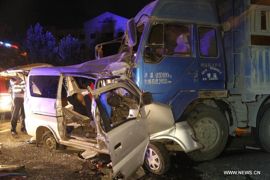 | Photo taken on Aug. 11, 2014 shows the site of traffic accident on the Jiangjiatun segment of Laojichang Road in Harbin, capital of northeast China's Heilongjiang Province. The accident occured on Monday night when a minibus slammed head into a truck, causing eight passengers in the minibus dead. (Xinhua/Xiao Jinbiao) |