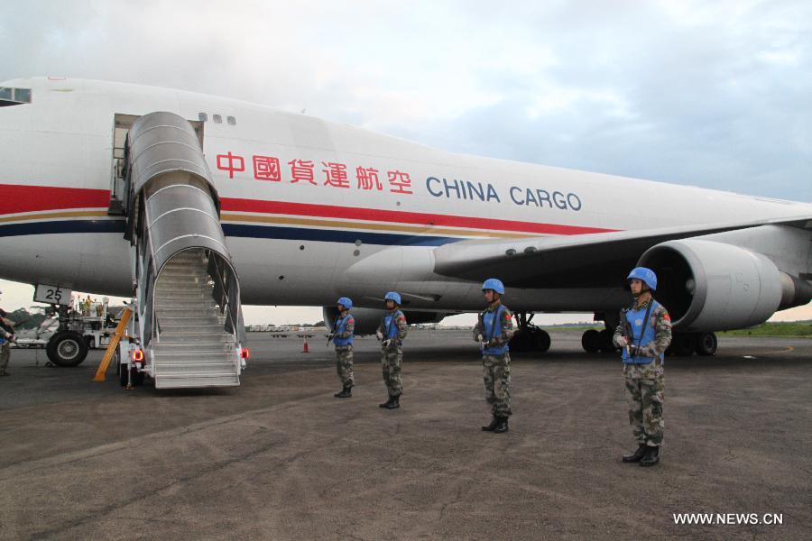 A Chinese plane carrying emergency humanitarian supplies for Liberia arrives at the airport in Monrovia, Liberia, Aug. 11, 2014, as part of effort to help the country contain the spread of Ebola. (Xinhua/Gao Bin)