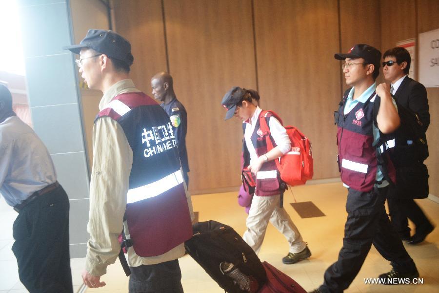 Three Chinese disease control experts (from 2nd L to 2nd R) arrive at the airport of Conakry, capital of Guinea, Aug. 11, 2014. The National Health and Family Planning Commission (NHFPC) announced on Saturday that China would send three expert teams and medical supplies to Guinea, Liberia and Sierra Leone to assist the prevention and control of the Ebola virus. (Xinhua)