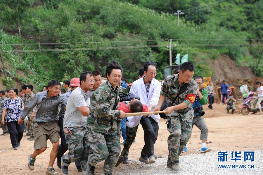 The rescue workers carry the wounded before loading him onto the helicopter. (Xinhua/Tao Liang)
