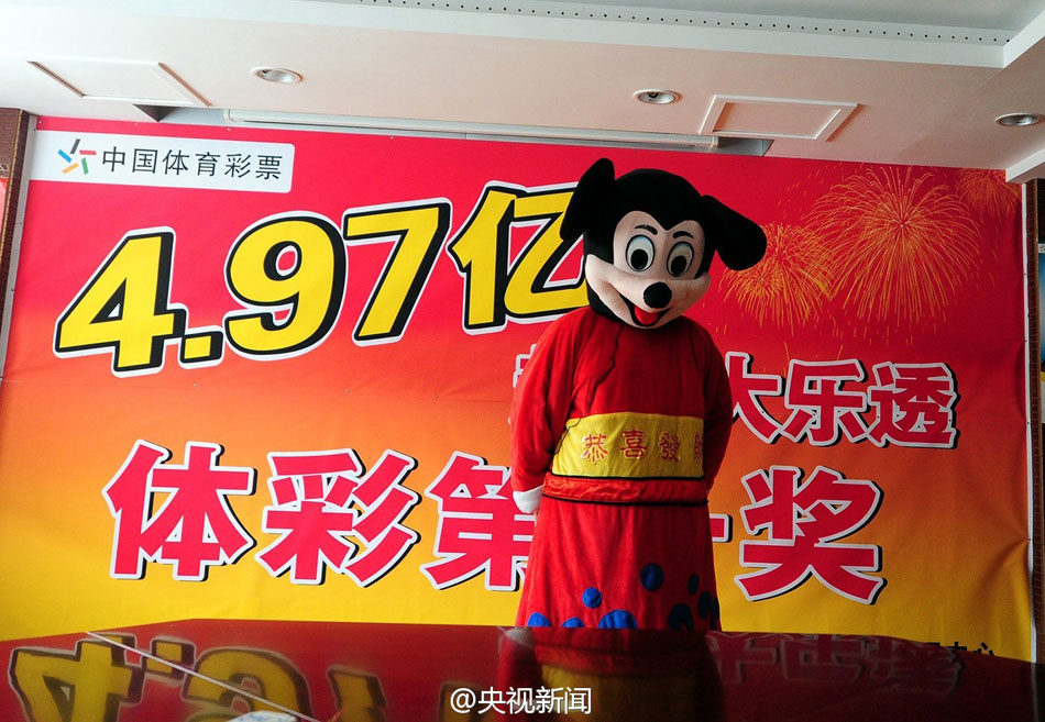 | A man in Zibo, East China’s Shandong province, wins a lottery that is worth 497 million yuan on Aug. 4, 2014. The winner dressed in a Mickey Mouse costume comes to the Sports Lottery Center in Shandong to claim the prize and establish a “Well-doer Fund” with 20 million to help people in need. (Photo/ CCTV Microblog) |