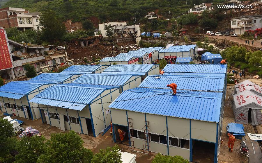Workers examine the newly-built Hope Primary School in Longtoushan Township in earthquake-hit Ludian County, southwest China's Yunnan Province, Aug. 12, 2014. The Hope Primary School, sponsored by China Youth Development Foundation and Yunnan Youth Development Foundation, is the first one built after the 6.5-magnitude earthquake. The school, which is able to accommodate more than 500 students, has 20 prefabricated rooms with each covering 56.8 square meters. A 6.5-magnitude earthquake hit Ludian of southwest China's Yunnan Province on Aug. 3, which claimed at least 617 lives and injured thousands of others. (Xinhua/Lin Yiguang)