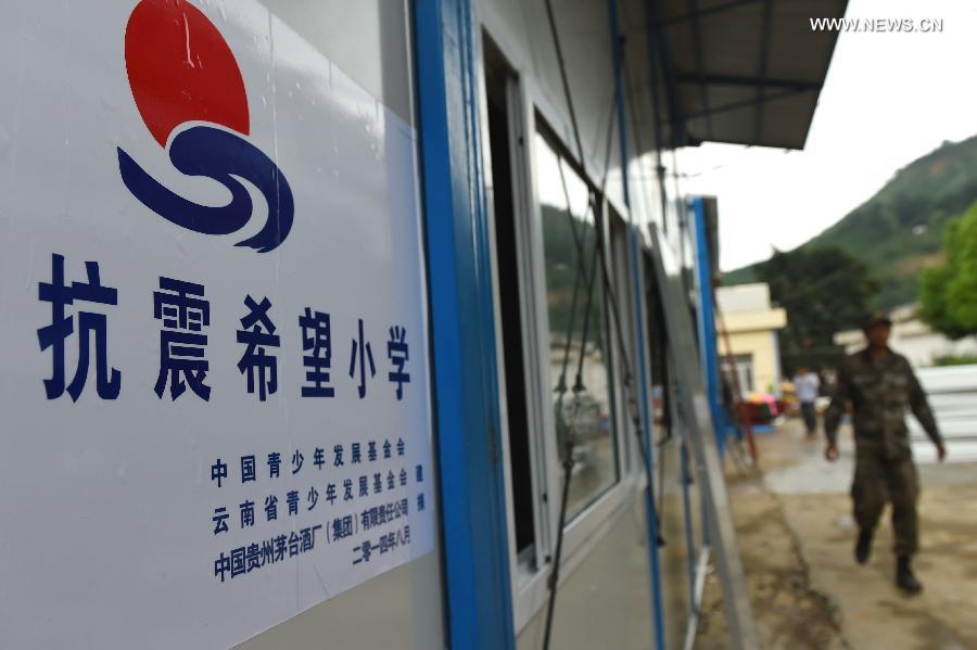 | The first Hope Primary School built after a 6.5-magnitude earthquake is inaugurated in Longtoushan Township in earthquake-hit Ludian County, southwest China's Yunnan Province, Aug. 12, 2014. The Hope Primary School, sponsored by China Youth Development Foundation and Yunnan Youth Development Foundation, is the first one built after the 6.5-magnitude earthquake. The school, which is able to accommodate more than 500 students, has 20 prefabricated rooms with each covering 56.8 square meters. A 6.5-magnitude earthquake hit Ludian of southwest China's Yunnan Province on Aug. 3, which claimed at least 617 lives and injured thousands of others. (Xinhua/Lin Yiguang) |