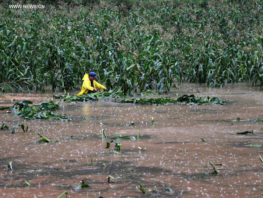A villager checks flooded corn field in Lexi village of Weining County, southwest China's Guizhou Province, Aug. 12, 2014. The death toll from continuous rains in southwest China's Guizhou Province has increased to 12, with 12 still missing, local authorities said Tuesday. (Xinhua/Yue Gang)
