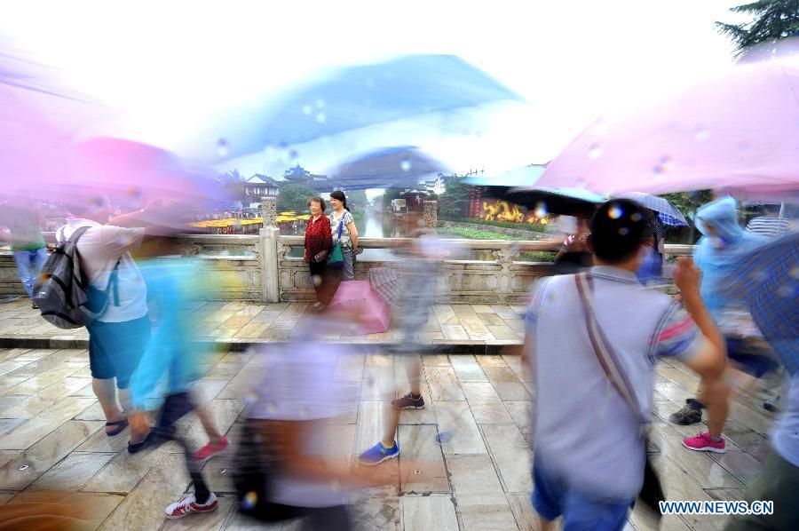 Tourists walk on the bridge of Qinhuai River in Nanjing, capital of east China's Jiangsu Province, on Aug. 13, 2014. The 2nd Summer Youth Olympic Games will be held in Nanjing from August 16 to 28. (Xinhua/Yue Yuewei)