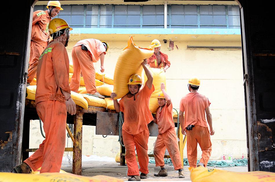 Workers load the truck with bean pulps. There is no shelter at Qingdao Port. Long time sun exposure makes the temperature in the truck as high as 60 degrees Celsius.(Iqilu/Sun Zhiwen)