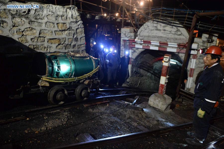Rescuers try to put a pump into the flooded well of the Anzhishun Coal Mine at the Chengzihe district of Jixi,in northeast China's Heilongjiang Province, early on Aug. 15, 2014. Twenty-three people have been trapped after the coal mine was flooded in Jixi City on Aug. 14. (Xinhua/Wang Kai)