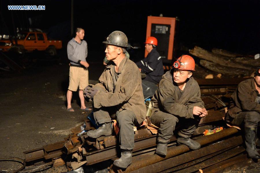 Rescuers stand by at the entrance to the flooded well of the Anzhishun Coal Mine at the Chengzihe district of Jixi,in northeast China's Heilongjiang Province, early on Aug. 15, 2014. Twenty-three people have been trapped after the coal mine was flooded in Jixi City on Aug. 14. (Xinhua/Wang Kai)