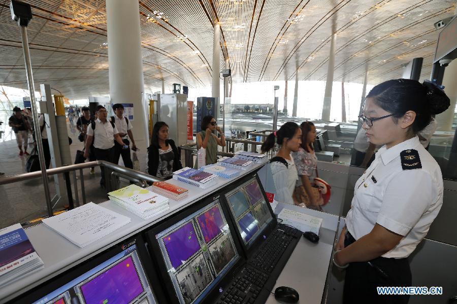 | A quarantine staff member monitors body temperatures of passengers who pass infrared thermometry machine at Beijing Capital International Airport in Beijing, capital of China, Aug. 14, 2014. To prevent the deadly Ebola virus from entering China, China's quarantine authority implements stricter inspections on inbound flights from regions affected by Ebola and step up sanitary measures on incoming goods. (Xinhua/Shen Bohan) |