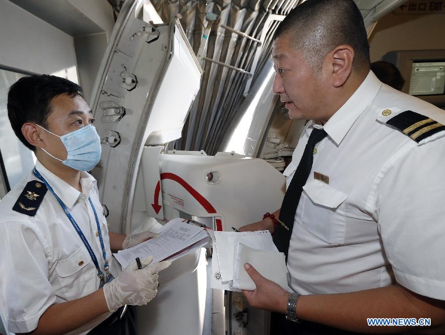 Quarantine staff member Zhang Yanmin (L) asks for passengers information from the crew chief of a flight which flies from Frankfurt, a possible transfer stop for travelers who have been to western Africa, at the Beijing Capital International Airport in Beijing, capital of China, Aug. 14, 2014. To prevent the deadly Ebola virus from entering China, China's quarantine authority implements stricter inspections on inbound flights from regions affected by Ebola and step up sanitary measures on incoming goods. (Xinhua/Shen Bohan)