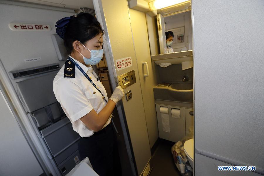 A quarantine staff member checks leftovers on a flight which flies from Frankfurt, a possible transfer stop for travelers who have been to western Africa, at the Beijing Capital International Airport in Beijing, capital of China, Aug. 14, 2014. To prevent the deadly Ebola virus from entering China, China's quarantine authority implements stricter inspections on inbound flights from regions affected by Ebola and step up sanitary measures on incoming goods. (Xinhua/Shen Bohan)