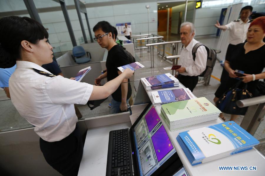 A quarantine staff member hands out brochures about preventing Ebola virus disease to passengers arriving at Beijing Capital International Airport in Beijing, capital of China, Aug. 14, 2014. To prevent the deadly Ebola virus from entering China, China's quarantine authority implements stricter inspections on inbound flights from regions affected by Ebola and step up sanitary measures on incoming goods. (Xinhua/Shen Bohan)