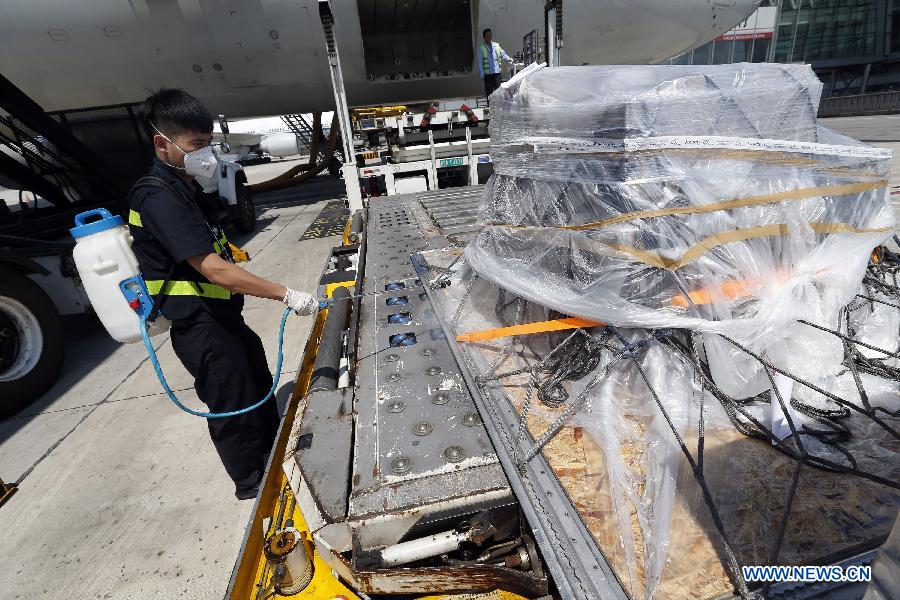 A quarantine staff member sterilizes a cargo from Frankfurt, a possible transfer stop for travelers who have been to western Africa, at the Beijing Capital International Airport in Beijing, capital of China, Aug. 14, 2014. To prevent the deadly Ebola virus from entering China, China's quarantine authority implements stricter inspections on inbound flights from regions affected by Ebola and step up sanitary measures on incoming goods. (Xinhua/Shen Bohan)