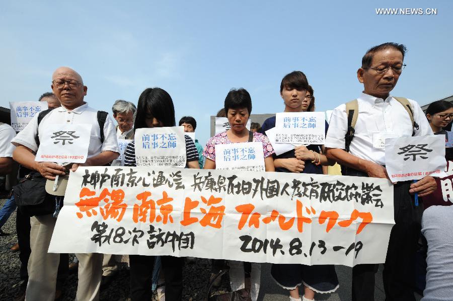 Delegates from Japan mourn for victims of the Nanjing Massacre during an assembly at the Memorial Hall of the Victims in Nanjing Massacre by Japanese Invaders in Nanjing, capital of east China's Jiangsu Province, Aug. 15, 2014. Friday marked the 69th anniversary of Japan's unconditional surrender at the end of world War II. (Xinhua/Sun Can)