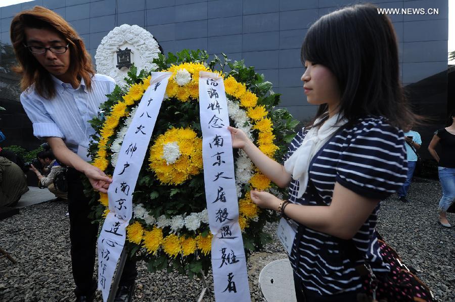 Delegates from Japan present a wreath to victims of the Nanjing Massacre during an assembly at the Memorial Hall of the Victims in Nanjing Massacre by Japanese Invaders in Nanjing, capital of east China's Jiangsu Province, Aug. 15, 2014. Friday marked the 69th anniversary of Japan's unconditional surrender at the end of world War II. (Xinhua/Han Yuqing)