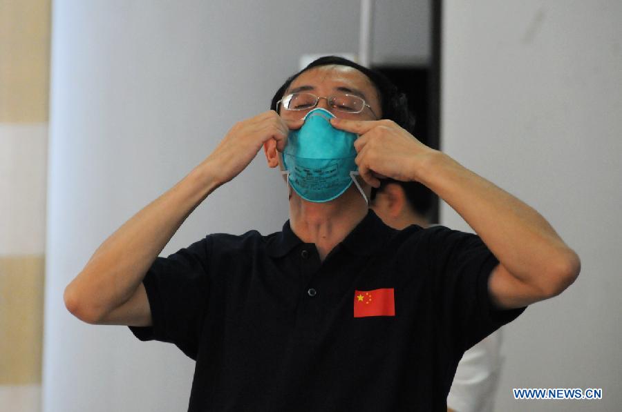 Members of Chinese medical expert team demonstrate during a training with Sierra Leone medical workers in Freetown, Sierra Leone, Aug. 14, 2014. China has sent three expert teams and medical supplies to Guinea, Liberia and Sierra Leone to assist in the prevention and control of the Ebola virus. (Xinhua/Lin Xiaowei)